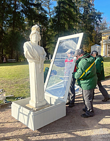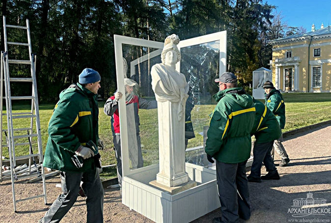 Эти традиционные ритуалы для сохранения красоты в Архангельском начинаются каждой осенью. Предстоящие морозы и снега могут испортить внешность мраморных жителей парка усадьбы. Защитят персонажей вот такие короба: стеклянные или деревянные.