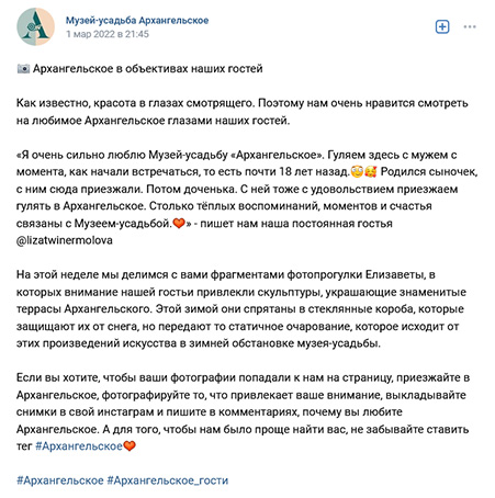 «Я очень сильно люблю Музей-усадьбу «Архангельское». Гуляем здесь с мужем с момента, как начали встречаться, то есть почти 18 лет назад.☺