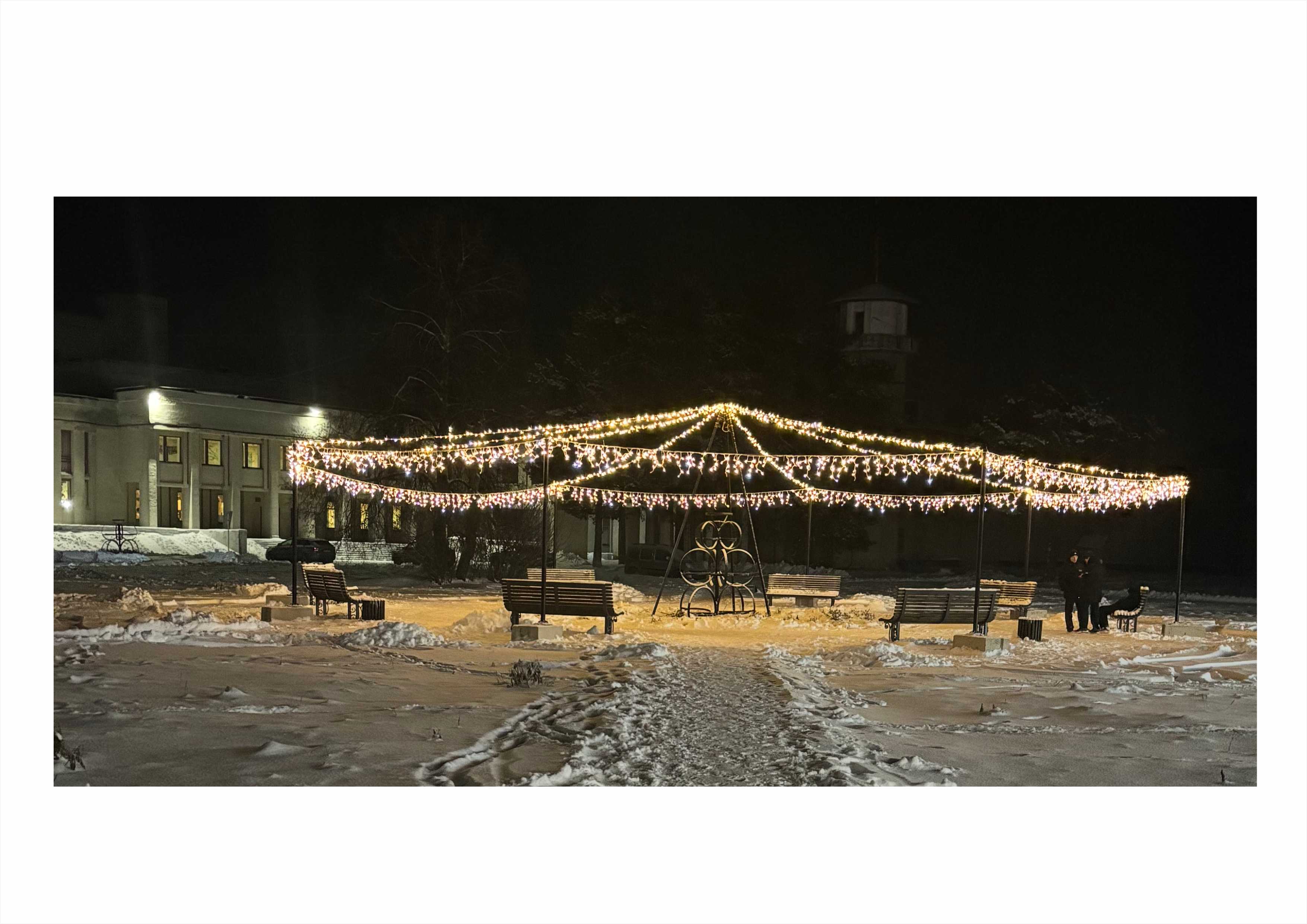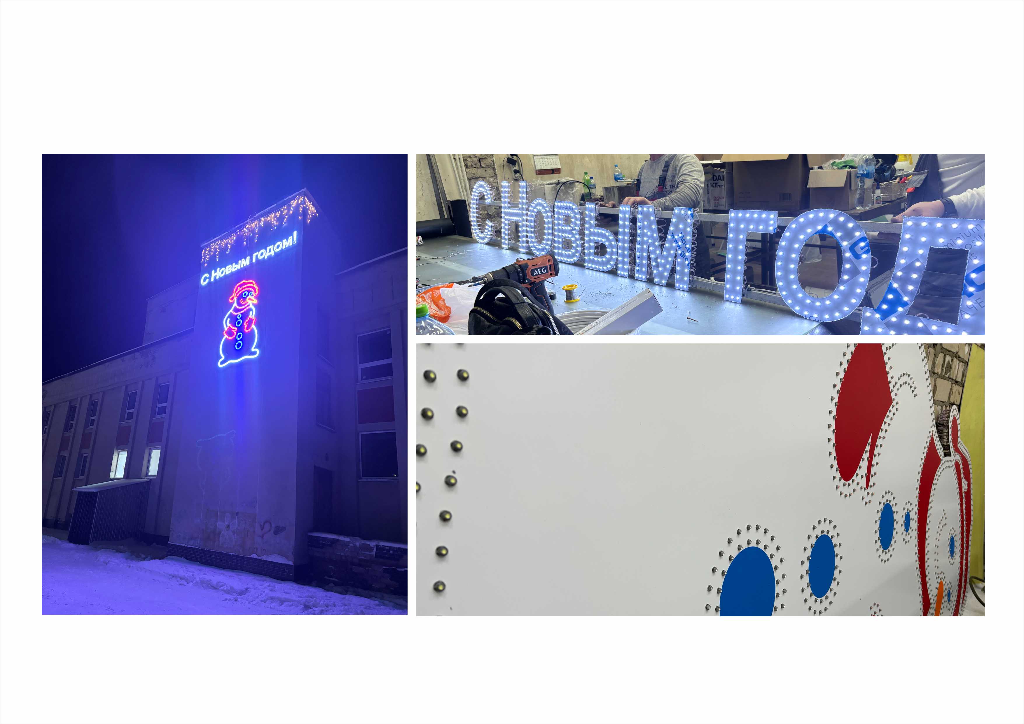 Новогодние световые конструкции: снеговик с надписью и шатер из световой гирлянды. п. Сухоногово