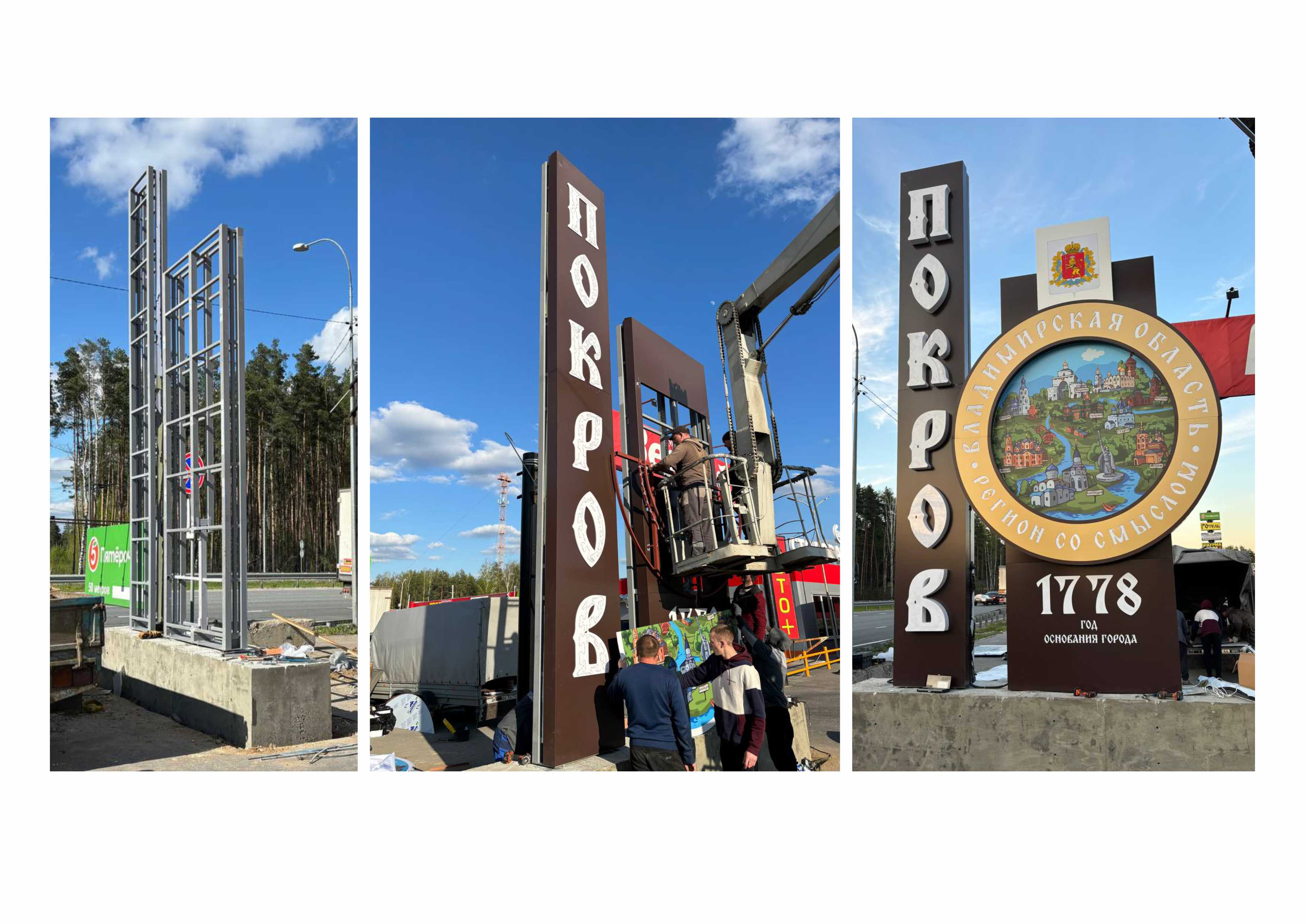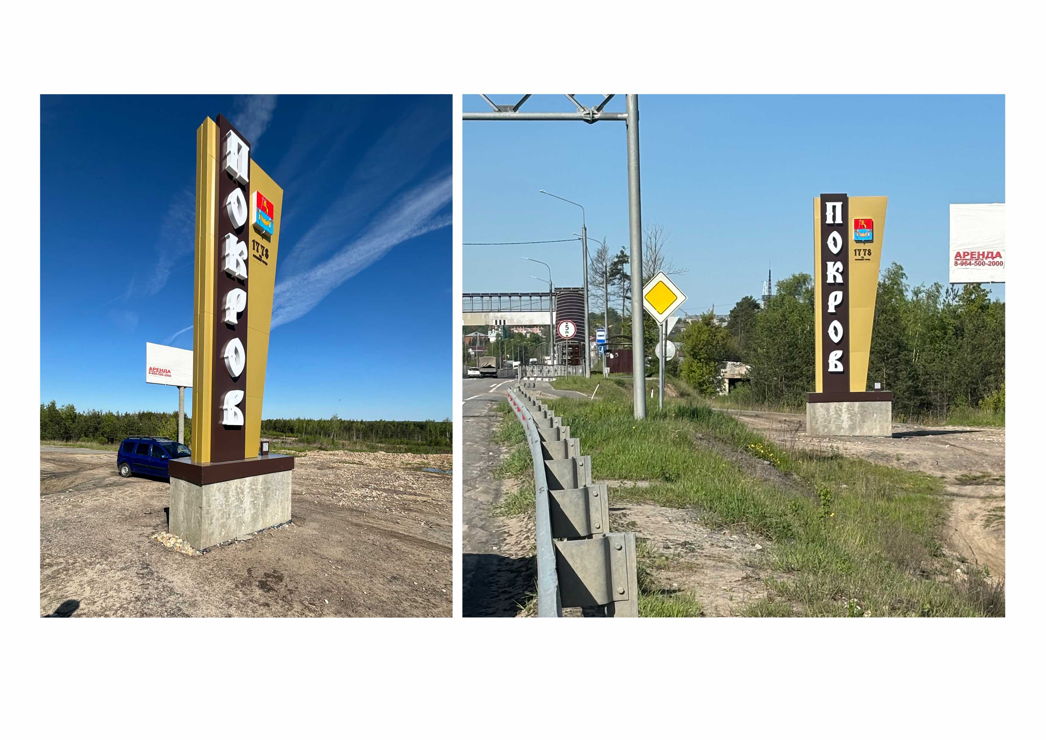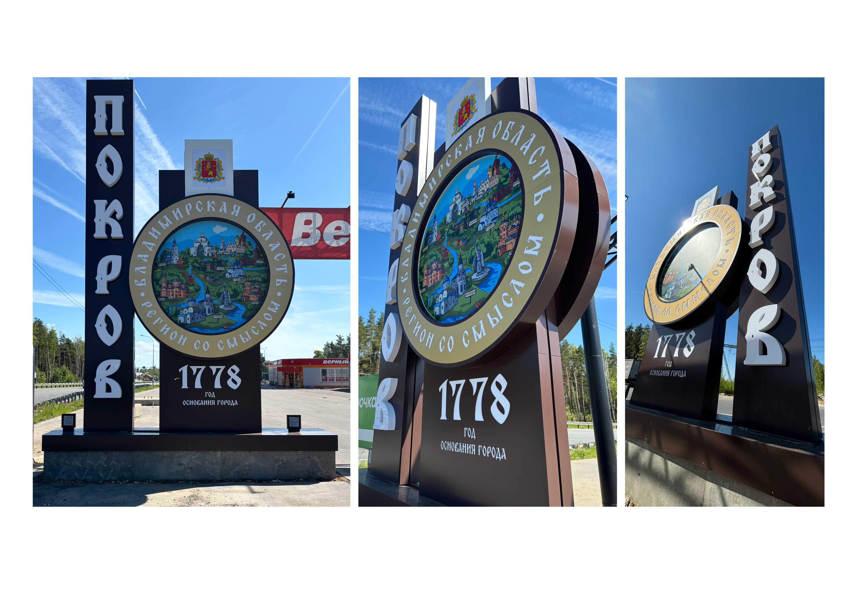 Два из них появятся на федеральной трассе М-7 «Волга» на въездах в города со стороны Москвы и со стороны Владимира. Это композиции из нескольких элементов: стелы и декоративного кольца с рисунком. На арт-объектах гербы муниципалитета, надписи «Покров», «Год основания город 1778» и «Владимирская область — регион со смыслом».