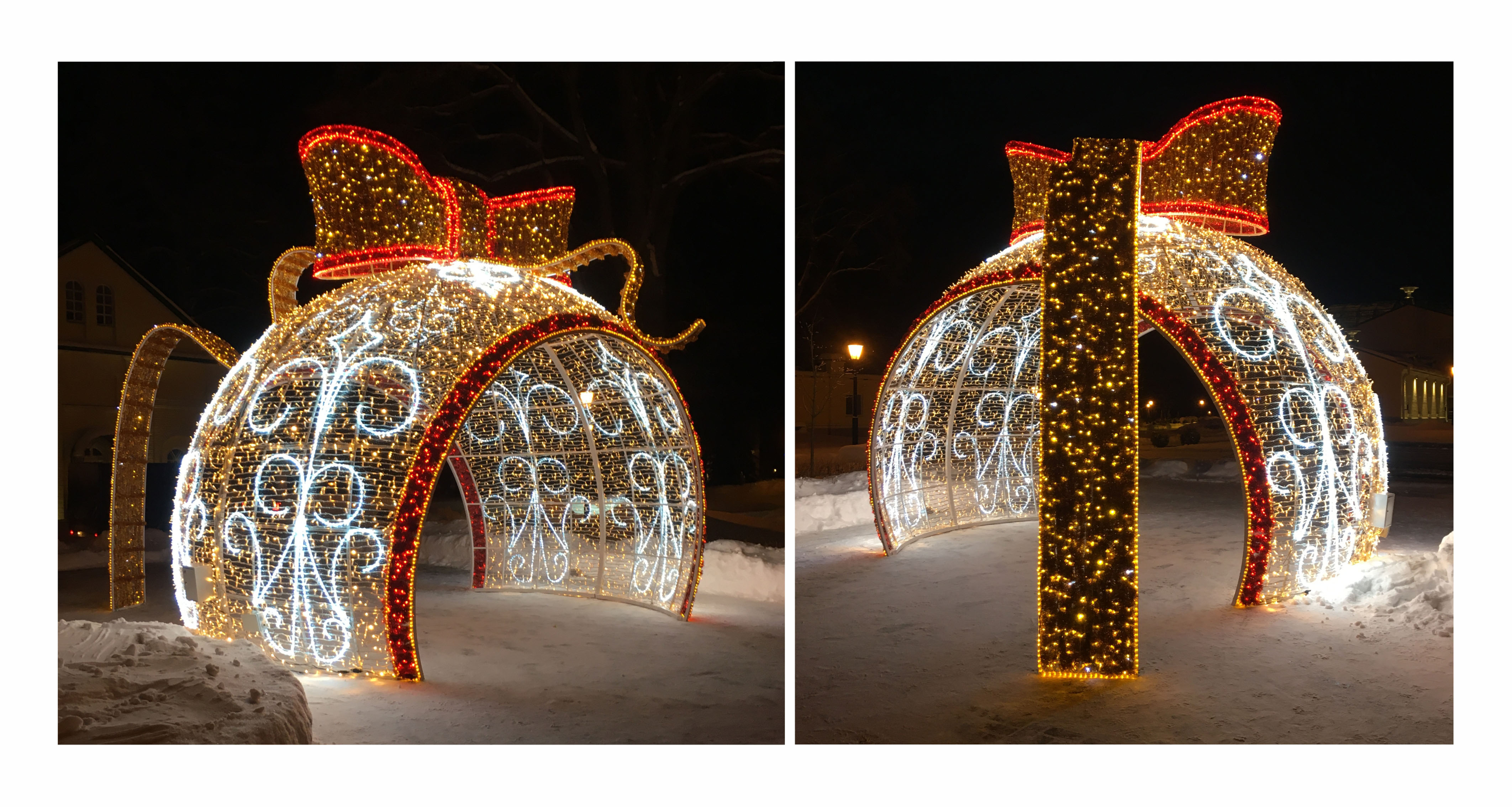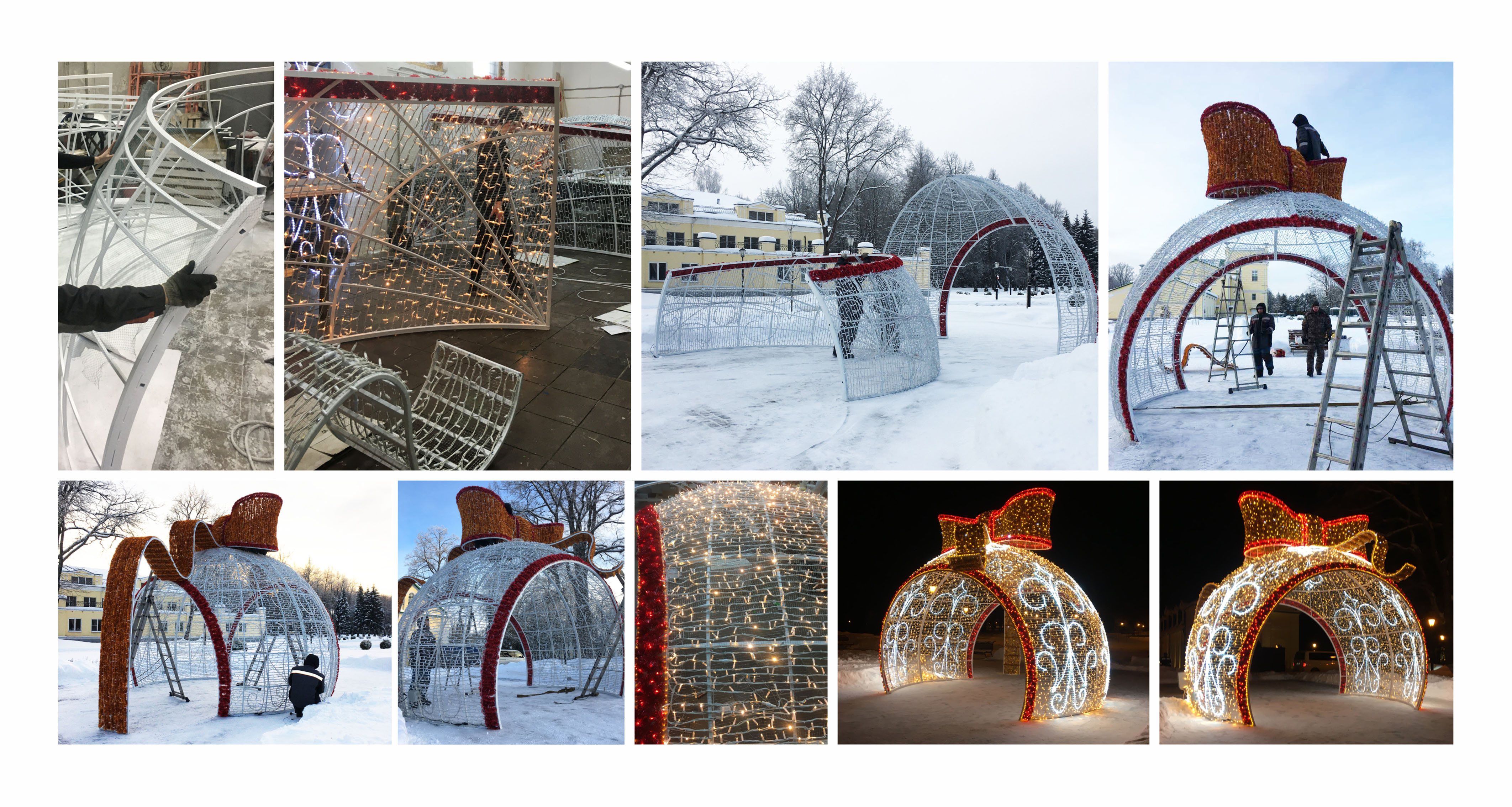 Новогодние световые конструкции: снеговик с надписью и шатер из световой гирлянды. п. Сухоногово